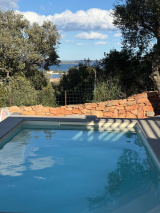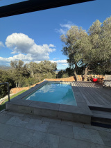 Dans le prolongement de cette belle pièce de vie, nous accédons à un espace extérieur, avec 1 terrasse avec pergola orienté Ouest avec une vue montagne, 1 terrasse avec pergola avec vue montagne et petite vue mer, avec en prolongement 1 pisine.